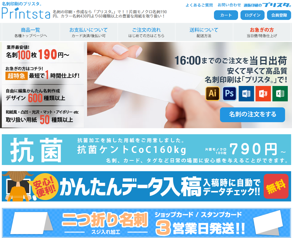 オリジナルデザインの名刺作成の場合は様々なフォーマットに対応しています。印刷のやり方や、用紙も豊富で、選んですぐ印刷できるようです!